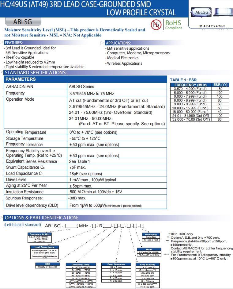| ABLSG-18.432MHZ-D2Y-T | Abracon晶振 | ABLSG | MHz Crystal | 18.432MHz |