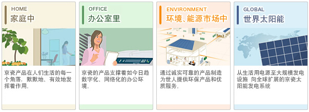 家庭、辦公室、社區(qū)乃至世界各地,京瓷的產品已成為我們生活中不可或缺的一部分.例如,將太陽光轉換成清潔能源的住宅用太陽能發(fā)電系統(tǒng);用于打印機、復印機、電腦等辦公室里各種通信設備相關業(yè)務的電子零部件;豐富社區(qū)溝通的京瓷通信設備相關業(yè)務等,尤其,京瓷新開發(fā)的能源管理系統(tǒng)可以有效控制電耗.從無電地區(qū)到大型太陽能發(fā)電站,京瓷的太陽能發(fā)電系統(tǒng)產生的清潔能源發(fā)揮著積極重要的作用.京瓷將通過各種高品質產品,為提高人們的生活水平做出貢獻.
