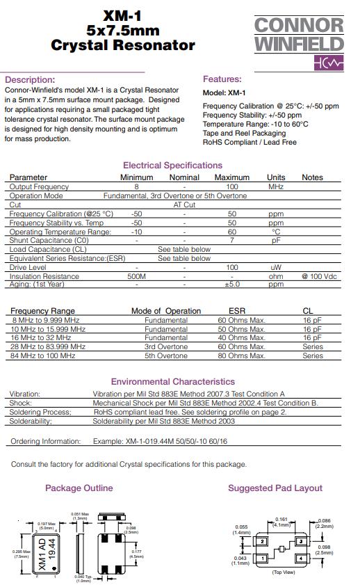 | XM-1-016.0M | Connor-Winfield | XM-1 | 16MHz | ±50ppm | ±50ppm | 16pF | 40 Ohm | -10°C ~ 60°C |