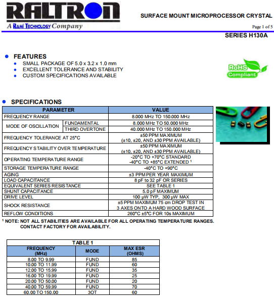 Raltron晶振,H130A晶振,石英晶體諧振器.小型石英貼片5032晶振,外觀尺寸具有薄型表面貼片型石英晶體諧振器,特別適用于有小型化要求的市場領(lǐng)域,比如智能手機,無線藍牙,平板電腦等電子數(shù)碼產(chǎn)品.晶振本身超小型,薄型,重量輕,晶體具有優(yōu)良的耐環(huán)境特性,如耐熱性,耐沖擊性,在辦公自動化,家電相關(guān)電器領(lǐng)域及Bluetooth,WirelessLAN等短距離無線通信領(lǐng)域可發(fā)揮優(yōu)良的電氣特性,滿足無鉛焊接的回流溫度曲線要求.