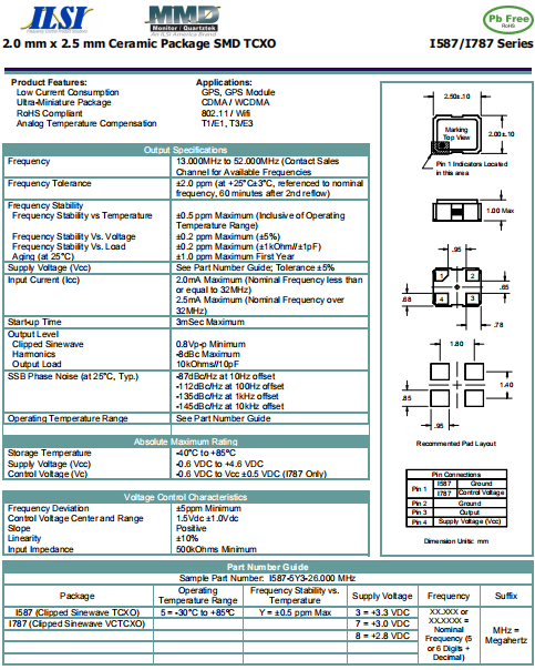 ILSI晶振,I587晶振,進口溫補晶振.小體積貼片2520mm晶振,外觀小型,表面貼片型晶體諧振器,因本身體積小等優勢,適用于移動通信終端的基準時鐘等移動通信領域.小型,薄型,輕型 (2.5 × 2.0 × 1.0mm typ.) 具備優良的耐環境特性及高耐熱性強.滿足無鉛焊接的回流溫度曲線要求.