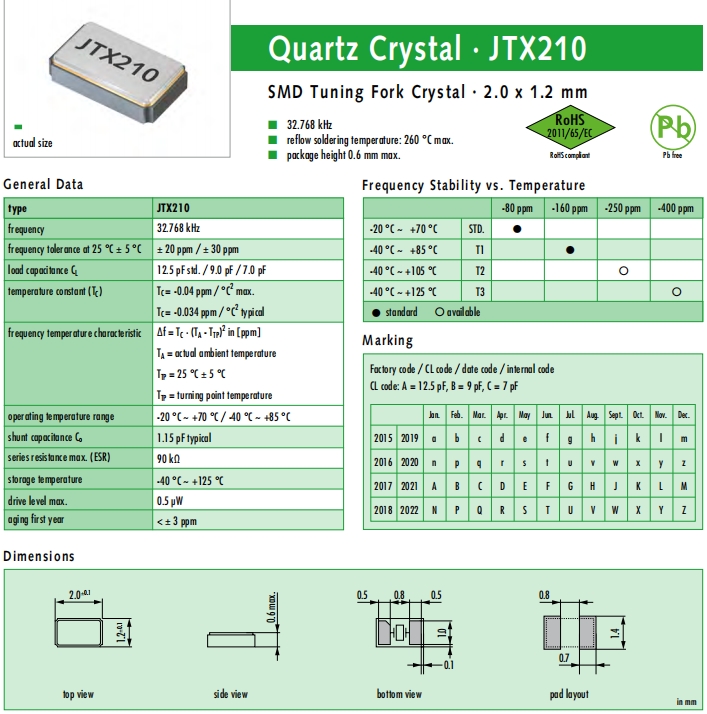 JAUCH晶振,JTX210晶振,石英晶體諧振器.32.768K系列具有超小型,薄型,質(zhì)地輕的表面貼片音叉型石英晶體諧振器,晶振產(chǎn)品本身具備優(yōu)良的耐熱性,耐環(huán)境特性,在辦公自動(dòng)化,家電領(lǐng)域,移動(dòng)通信領(lǐng)域可發(fā)揮優(yōu)良的電氣特性,符合無鉛標(biāo)準(zhǔn),滿足無鉛焊接的回流溫度曲線要求,金屬外殼的石英晶振使得產(chǎn)品在封裝時(shí)能發(fā)揮比陶瓷晶振外殼更好的耐沖擊性能.