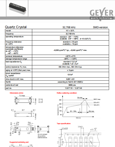 Geyer晶振,KX-327L晶振,環(huán)保石英晶體.貼片石英晶體,體積小,焊接可采用自動(dòng)貼片系統(tǒng),產(chǎn)品本身小型,表面貼片晶振,特別適用于有小型化要求的電子數(shù)碼產(chǎn)品市場(chǎng)領(lǐng)域,因產(chǎn)品小型,薄型優(yōu)勢(shì),耐環(huán)境特性,包括耐高溫,耐沖擊性等,在移動(dòng)通信領(lǐng)域得到了廣泛的應(yīng)用,晶振產(chǎn)品本身可發(fā)揮優(yōu)良的電氣特性,滿足無(wú)鉛焊接的高溫回流溫度曲線要求.