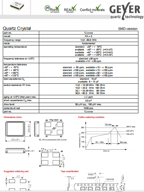 Geyer晶振,KX-6晶振,SMD石英晶體諧振器.普通石英晶振,外觀完全使用金屬材料封裝的,產品本身采用全自動石英晶體檢測儀,以及跌落,漏氣等苛刻實驗.產品本身具有高穩定性,高可靠性的石英晶體諧振器,焊接方面支持表面貼裝,外觀采用金屬封裝,具有充分的密封性能,晶振本身能確保其高可靠性,采用編帶包裝,可對應產品應用到自動貼片機告訴安裝,滿足無鉛焊接的高溫回流溫度曲線要求.