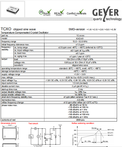 Geyer晶振,KXO-81晶振,溫補晶振.小型SMD有源晶振,從最初超大體積到,有著翻天覆地的改變,體積的變小也使產品帶來了更高的穩定性能,接縫密封石英晶體振蕩器,精度高,覆蓋頻率范圍寬的特點,SMD高速自動安裝和高溫回流焊設計,Optionable待機輸出三態輸出功能,電源電壓范圍:1.8~5 V,高穩定性,低抖動,低功耗,主要應用領域:無線通訊,高端智能手機,平板筆記本WLAN,藍牙,數碼相機,DSL和其他IT產品的晶振應用,三態功能,PC和LCDM等高端數碼領域,符合RoHS/無鉛.