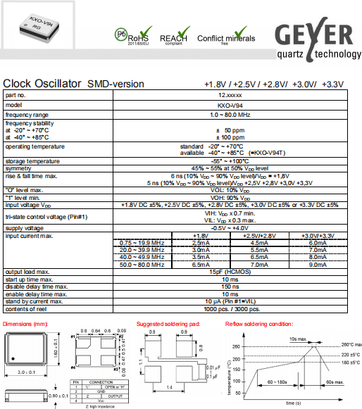 Geyer晶振,KXO-V94晶振,普通有源晶體振蕩器.貼片式石英晶體振蕩器,低電壓?jiǎn)?dòng)功率,并且有多種電壓供選擇,比如有1.8V,2.5V,3.3V,3.8V,5V等,產(chǎn)品被廣泛應(yīng)用于,平板筆記本,GPS系統(tǒng),光纖通道,千兆以太網(wǎng),串行ATA,串行連接SCSI,PCI-Express的SDH / SONET發(fā)射基站等領(lǐng)域.符合RoHS/無(wú)鉛.