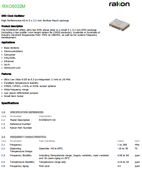 Rakon晶振,RXO5032M晶振,低抖動(dòng)振蕩器.貼片式石英晶體振蕩器,低電壓?jiǎn)?dòng)功率,并且有多種電壓供選擇,比如有1.8V,2.5V,3.3V,3.8V,5V等,產(chǎn)品被廣泛應(yīng)用于,平板筆記本,GPS系統(tǒng),光纖通道,千兆以太網(wǎng),串行ATA,串行連接SCSI,PCI-Express的SDH / SONET發(fā)射基站等領(lǐng)域.符合RoHS/無(wú)鉛.