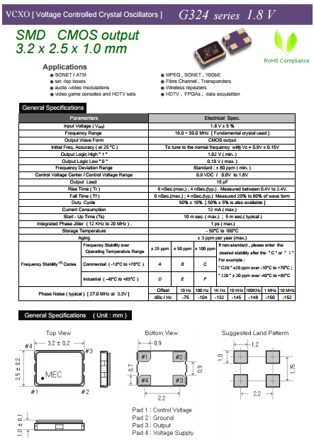 MERCURY晶體,壓控晶體振蕩器,G324晶振.有源晶振,是只晶體本身起振需要外部電壓供應(yīng),起振后可直接驅(qū)動(dòng)CMOS 集成電路,產(chǎn)品本身已實(shí)現(xiàn)與薄型IC(TSSOP封裝,TVSOP封裝)同樣的1mm厚度,斷開(kāi)時(shí)的消費(fèi)電流是15 µA以下,編帶包裝方式可對(duì)應(yīng)自動(dòng)搭載及IR回流焊接(無(wú)鉛對(duì)應(yīng))產(chǎn)品有幾種電壓供選.