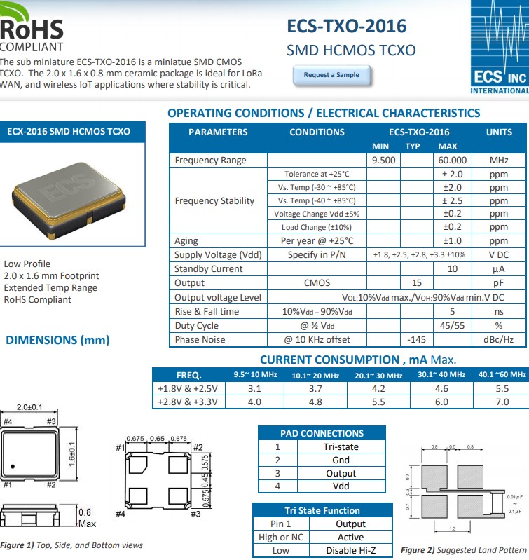 The sub miniature ECS-TXO-2016 is a miniatue SMD CMOS TCXO. The 2.0 x 1.6 x 0.8 mm ceramic package is ideal for LoRa WAN, and wireless IoT applications where stability is critical.