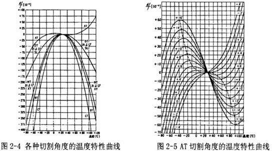 圖2-1是不同切割角度的溫度特性的比較。從圖中可以看出,當(dāng)溫度在大于30℃時(shí),按照AT角度切割的石英晶片的特性曲線比其他的特性曲線都平坦,說(shuō)明在此溫度范圍內(nèi)溫度變化后頻率產(chǎn)生的偏移量最小,溫度特性也最佳,如圖2-5所示,同是AT切割的時(shí)候,當(dāng)切割角度有少量偏差時(shí)溫度特性曲線也會(huì)隨之變化。