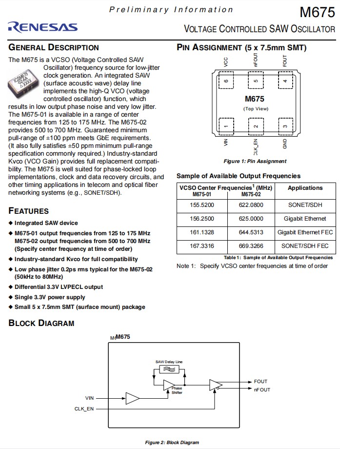 | M675-01-BB | IDT晶振 | OSC VCSO 156.25MHZ LVPECL SMD | M675 |