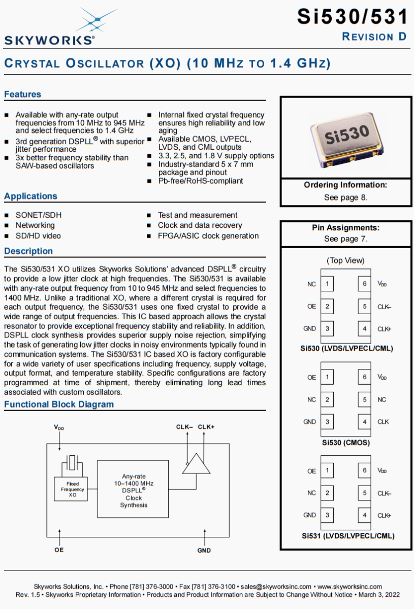 | 536BB150M000DG | Skyworks晶振 | Si536 | XO | 150 MHz | LVDS | 3.3V | ±20ppm |