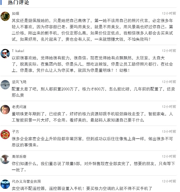 根據(jù)格力官方銷售平臺顯示,目前只賣出5臺,這款手機(jī)據(jù)說是董明珠親自代言做廣告,手機(jī)開機(jī)畫面即為董明珠本人,希望能讓國人愛上中國制造。這銷量可真是震驚了整個(gè)手機(jī)界。之前董明珠大膽放言:“華為賣老大,我就賣老二嘛。”但是,理想很美好,現(xiàn)實(shí)卻很殘酷。董明珠的豪言與現(xiàn)在目前銷量上很不符合,由此,各種聲音此起彼伏“董大媽對于這你真不怕被打臉么?”借助網(wǎng)友的話,"那個(gè)開機(jī)畫面,實(shí)在是看著心累,董大媽太搶鏡。""建議董大媽不要再折騰做手機(jī)了,好好做格力空調(diào)吧,把空調(diào)質(zhì)量再進(jìn)一步的完美"等等之類的話,可讓網(wǎng)友們操碎了心,我們來看看網(wǎng)友的一些評論,此評論來源由騰訊網(wǎng):