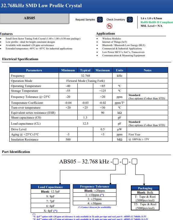 更多>>低輪廓超小型石英晶體ABS05-32.768KHZ-9-T用于藍牙低能量應用