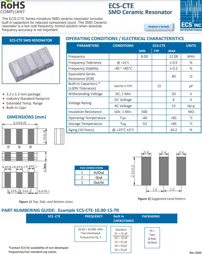 ECS晶振ECS‐CTE系列陶瓷諧振器的ESR為40ω,小體積晶振尺寸采用3.2x1.3x1.0mm封裝三腳貼片晶振。這些陶瓷諧振器非常適合絕對頻率精度不太重要的低成本應用。標準版本在+25°C時的頻率容差為0.5%,在整個溫度范圍內的頻率容差為0.2%。內置電容值選項:10pF,15pF,22pF,30pF和33pF。ECS-CTE-10.00-15-TR是復印機和遙控器等低成本應用的理想選擇。