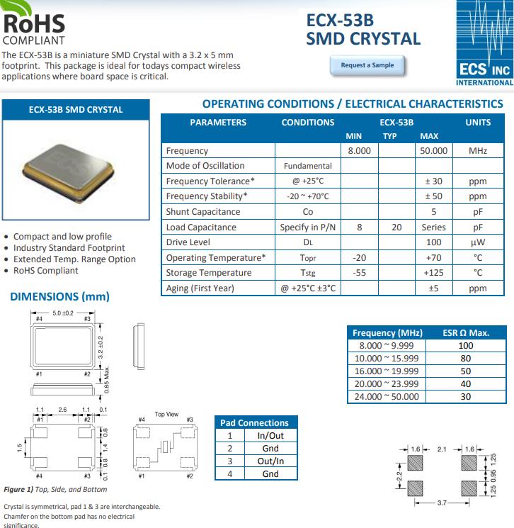 編碼ECS-120-8-30B-CKM,ECX-53B是一個(gè)5.0x 3.2MM的微型SMD晶振足跡。這個(gè)包是理想的今天緊湊型無線電路板空間非常重要的應(yīng)用程序。緊湊、低調(diào)行業(yè)標(biāo)準(zhǔn)足跡,擴(kuò)展溫度范圍選項(xiàng),符合RoHS標(biāo)準(zhǔn).