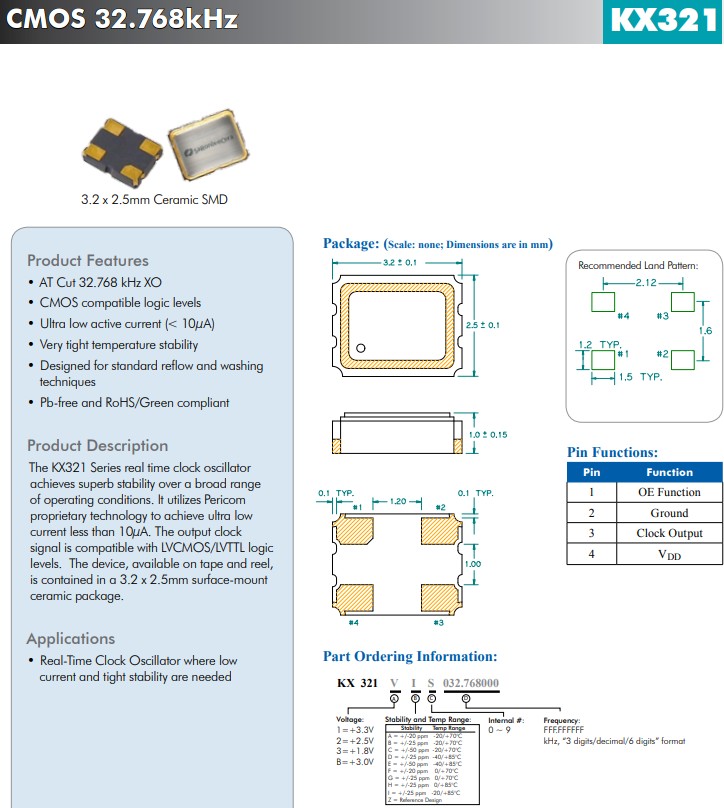 KX321系列實時時鐘振蕩器在廣泛的工作條件下實現了卓越的穩定性。1.8V/2.5V/3.3V, 小體積晶振尺寸3.2x2.5mm, 32.768k,CMOS晶體振蕩器,它利用Pericom專有技術實現小于10μA的超低電流。輸出時鐘信號與 LVCMOS/LVTTL 邏輯電平兼容。該器件采用卷帶包裝,采用3.2x2.5mm表面貼裝陶瓷封裝。