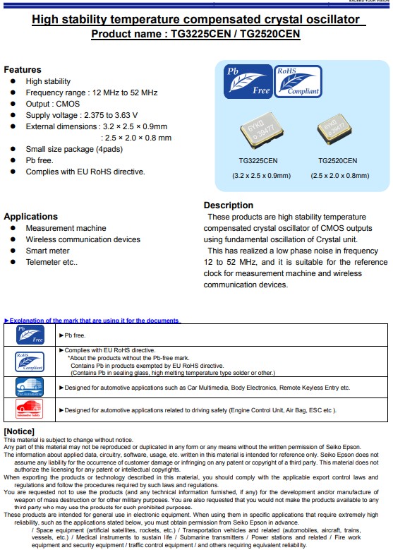 日本愛普生晶振TG2520CEN,是一款TCXO溫補(bǔ)晶振,小體積晶振尺寸2.5x2.0mm有源晶振,四腳貼片晶振,石英晶體振蕩器,電源電壓2.375V至3.63V,具有高穩(wěn)定溫度CMOS輸出的補(bǔ)償晶體振蕩器,超小型,輕薄型,低抖動,低功耗,低損耗,低耗能,低電源電壓,高穩(wěn)定性等特點(diǎn),利用晶體單元的基本振蕩。這實(shí)現(xiàn)了頻率中的低相位噪聲12MHz至52MHz,適合用作基準(zhǔn)電壓源,無線通信設(shè)備,智能電表,遙測儀,測量機(jī)器和無線的時鐘通訊設(shè)備。