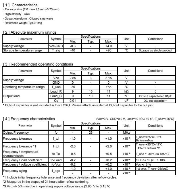 | X1G004131001016 | TG-5006CJ | 26.000000 MHz | 2.00 x 1.60 x 0.73 mm | 2.850 to 3.150 V | +/-2.0 ppm | -30 to +85 °C | +/-0.50 ppm |