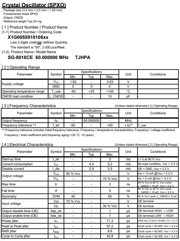 | X1G005591010600 | SG-8018CE | 60.000000 MHz | 3.20 x 2.50 x 1.20 mm | CMOS | 1.620 to 3.630 V | -40 to 105 °C | +/-50 ppm | ≤ 5.2 mA |