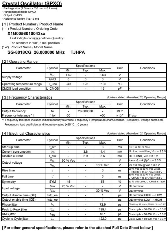 | X1G005601004300 | SG-8018CG | 26.000000 MHz | 2.50 x 2.00 x 0.80 mm | CMOS | 1.620 to 3.630 V | -40 to 105 °C | +/-50 ppm | ≤ 4.4 mA |