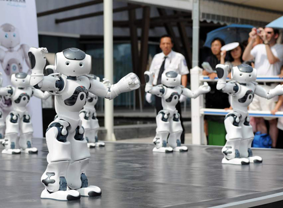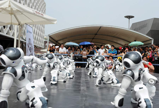 上海世博會迎來法國館國家館日活動。在法國館外,20個憨態(tài)可掬的機器人“腦”和著音樂的節(jié)拍,為觀眾帶來精彩的集體舞表演,吸引了眾多觀眾觀看。據(jù)介紹,身高58厘米的機器人“腦”,跳舞、爵士樂、足球樣樣精通,還通曉20多個國家的語言,被一些觀眾稱為“小天才”。