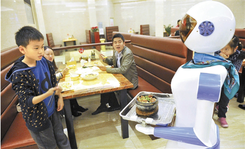 這是一家餐廳剛剛開業(yè),里面有5個機器人:兩個送餐,并且能報出各種菜名,三個小機器人在門口跳舞助興。機器人送餐、跳舞助興,這些以往只能在科幻電影中看到的場面,在寧波慈溪的一家餐廳成為現(xiàn)實。據(jù)老板利用機器人送餐,相比雇人,光兩個送菜機器人一年能省20多萬元。