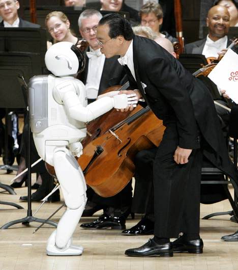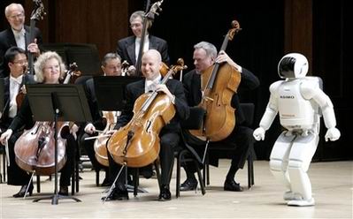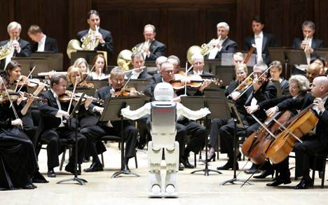 機器人現(xiàn)場指揮交響樂 點頭鞠躬無所不能,在一片暗淡光線的籠罩下,坐無缺席的音樂大廳逐漸安靜下來,指揮家像模像樣地走了出來,站在觀眾面前的是一個全身閃著亮光的白顏色機器人,高4英尺三英寸。這個非同尋常的機器人名為ASIMO,它于本周二晚接受了一次嚴峻挑戰(zhàn):現(xiàn)場指揮底特律交響樂團,樂團演奏的是百老匯音樂劇《夢幻騎士》中的精彩曲目《不可能的夢想》。ASIMO以小孩子的口吻對觀眾說:“大家好”,隨后向樂隊擺手,示意演出開始。