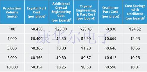 由于項目設計延遲而導致的機會成本未計入以下計算中,這在某些市場中可能是巨大的.在某些情況下,外部服務和測試會產生額外費用,而這些費用也可能是巨大的.此外,還有其他懲罰措施,例如,用于板子重新旋轉的附加材料/組件的成本,晶體所需的負載電容器的成本以及電容器所消耗的額外板子空間,所有這些都會使方程式更傾向于使用有源晶振.為簡單起見,在以下示例中,我們僅包括了計時組件的成本和糾正晶體問題的工程時間.