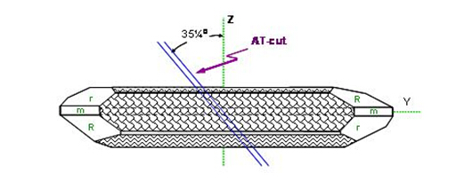 在各種不同種類的切割角度方式中, AT角度切割的石英芯片適用在數(shù)MHz到數(shù)佰MHz的頻率范圍,是石英芯片應(yīng)用范圍最廣范及使用數(shù)量最多的一種切割應(yīng)用方式. 在(圖五)中, 從石英晶棒X-軸向的上視圖, 可以看到對(duì)Z-軸向旋轉(zhuǎn)約35度的AT 方向. 這在大量生產(chǎn)的技術(shù)上也是很好達(dá)成的一種作業(yè)方式.