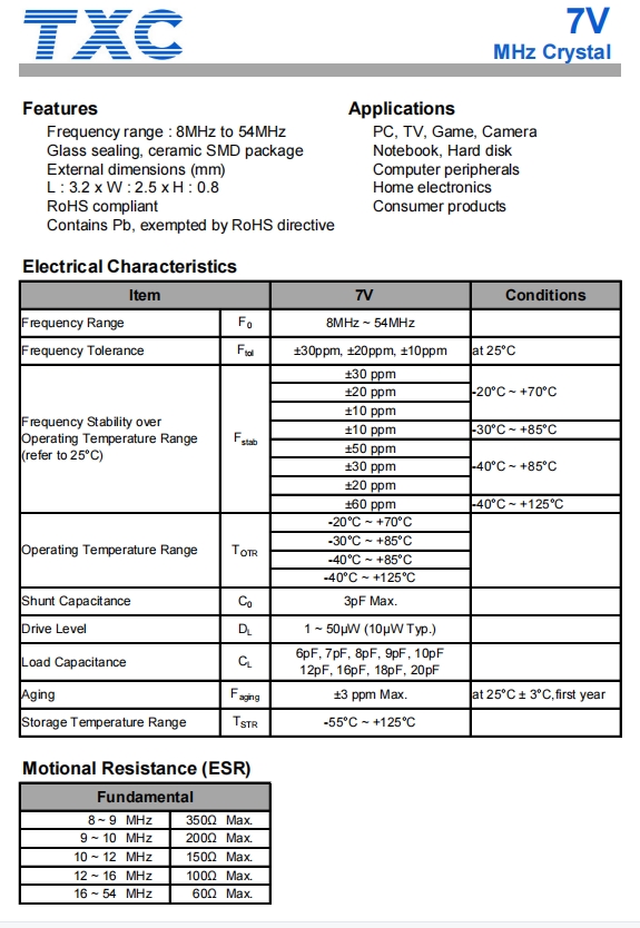 7A-14.31818MAAE-T TXC晶振 7A MHz Crystal 14.31818MHz ±30ppm -20°C ~ 70°C