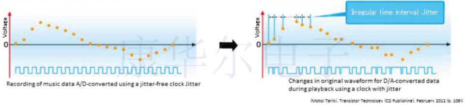頻率穩(wěn)定性(頻率在延長的時(shí)間內(nèi)不會變化的特性)通常被視為晶體振蕩器的重要屬性.但是,音頻設(shè)備需要短期而不是長期的穩(wěn)定性.在這樣的背景下,通常將頻率穩(wěn)定度約為±30~±100ppm的SPXO(*4)用作主時(shí)鐘.高端音頻系統(tǒng)可能會配備OCXO(*5)來獲得更高質(zhì)量的聲音.